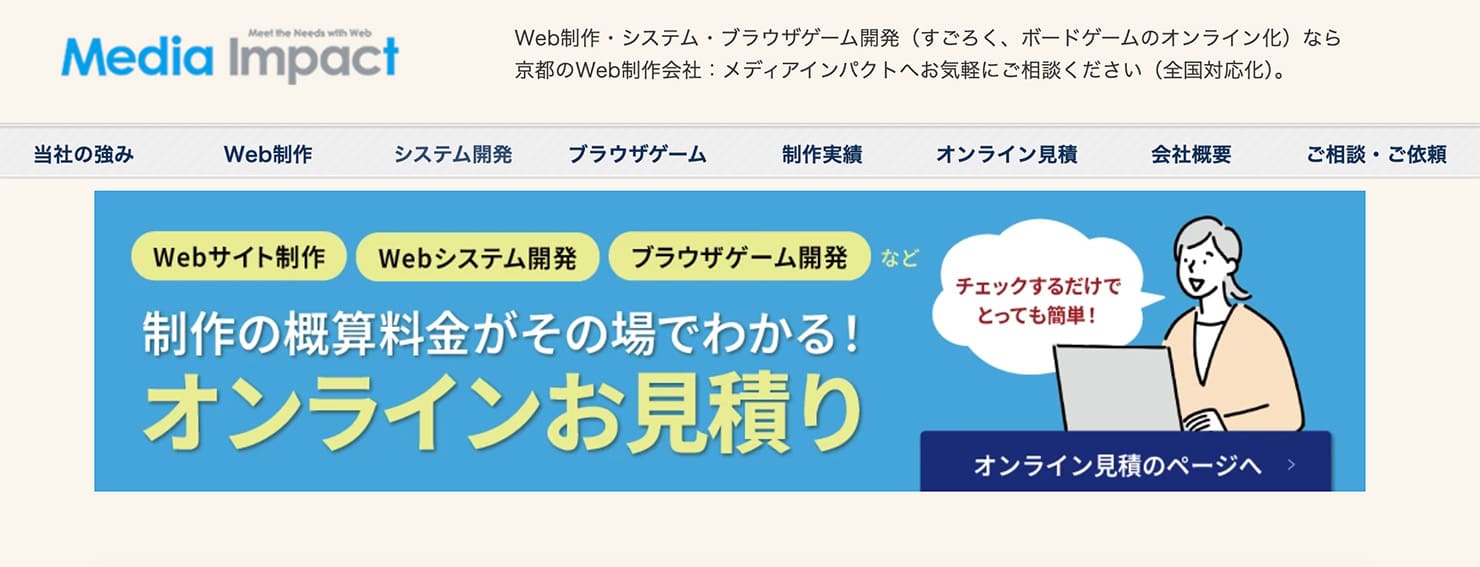 京都のWeb制作・システム開発会社。サイト制作だけでなく、Webコンサルや広告運用、さらにブラウザゲーム開発など“体験設計”系の開発領域もカバー。
