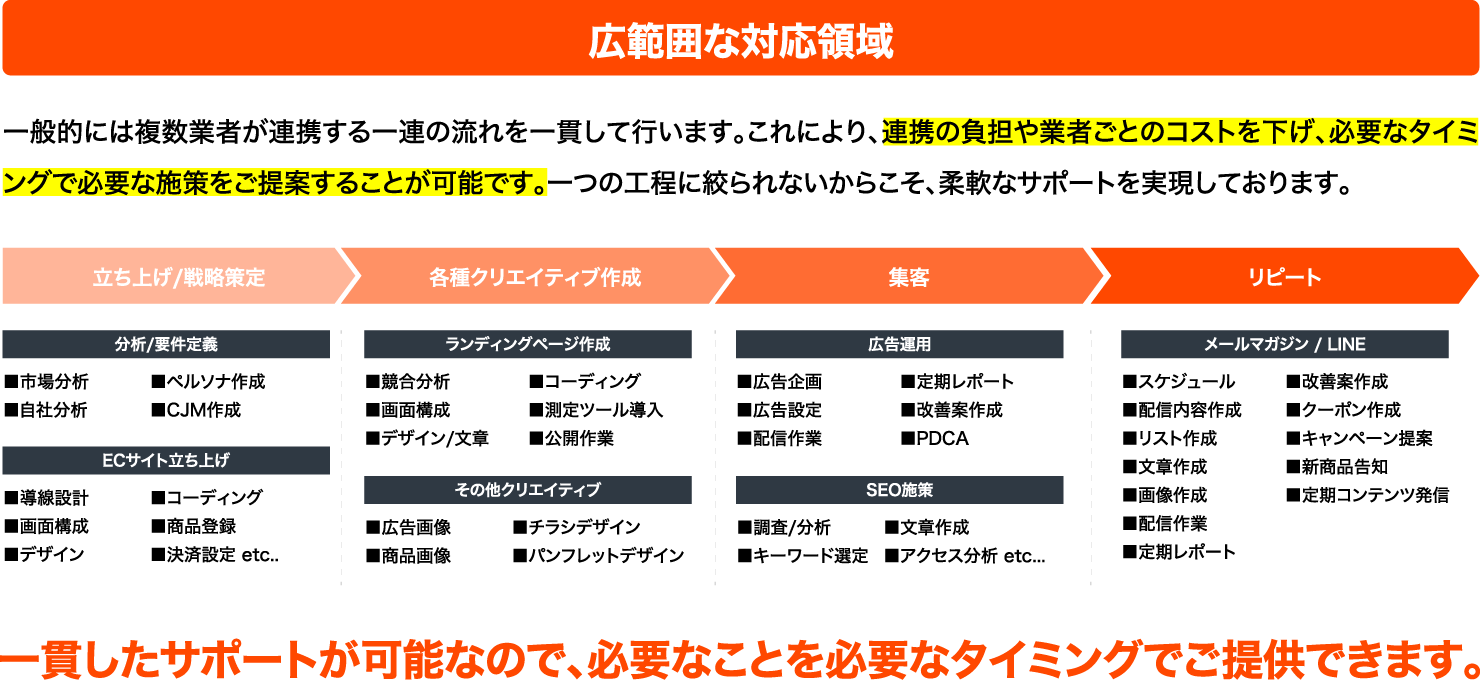 コンバートECでは戦略設計〜構築〜運用支援を網羅的にサポートすることに重きをおいています。
