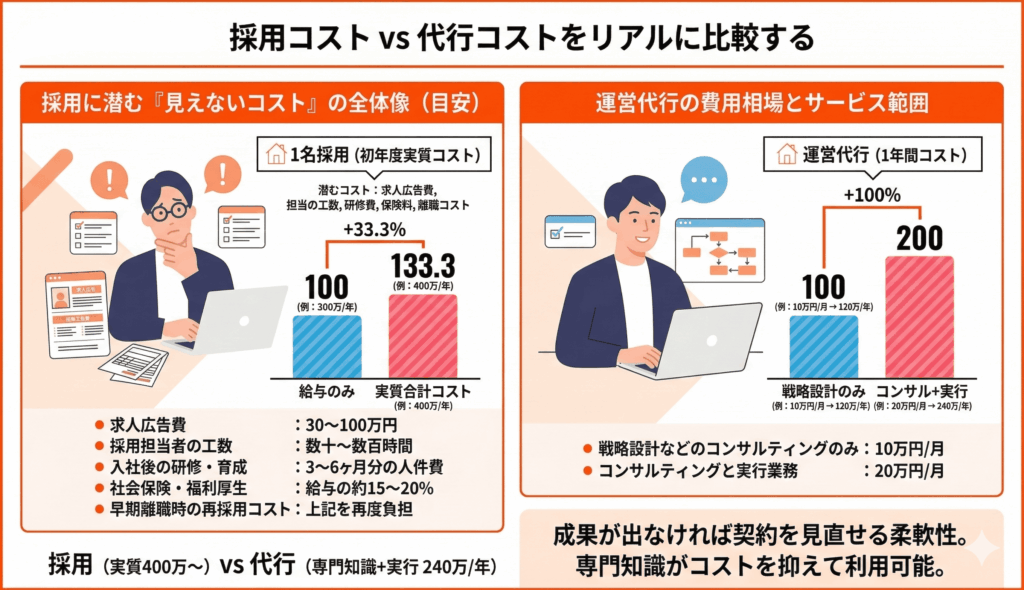 採用と比較したときの最大のメリットは、成果が出なければ契約を見直せる点です。採用の場合、即戦力でなかったとしても簡単に関係を解消することはできませんが、代行であれば業務範囲や契約内容を柔軟に調整できます。