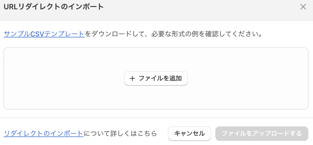 Shopifyのリダイレクト機能には「CSVによるインポート機能」があり、ページが大量にある場合はこちらで対応することが多いです。